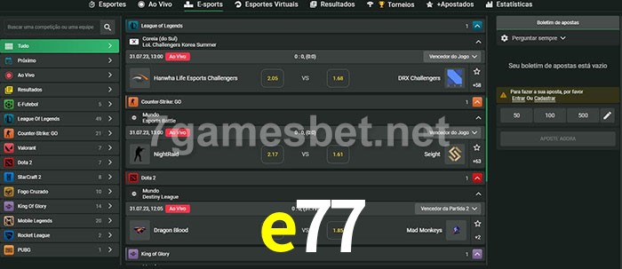 O e77 oferece uma grande seleção de opções de apostas em e-sports com probabilidades competitivas
